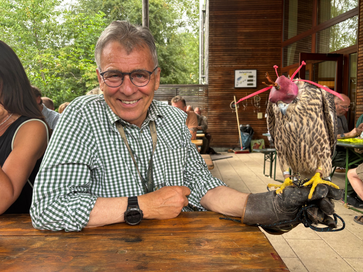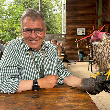 Und trotzdem ist es natürlich keineswegs so, dass Falknerinnen und Falkner aufhören, Falknerinnen und Falkner zu sein, nur weil ihnen ihr freundlicher Landesverband in der Oberpfalz ein Gratis-Festessen hinstellt – durchaus im Gegenteil! Katharina Weinberger zum Beispiel nutzt die Fahrt nach Regenstauf, um unterwegs zwei adulte Turmfalken wieder in die Freiheit zu entlassen, die sie in den Wochen zuvor mühsam gesund gepäppelt hat; in ihrem Revier seien die Rückkehrer von Artgenossen begeistert begrüßt worden, erzählt sie strahlend. Klaus Leix ist sogar gleich ganz mit Falke angereist: Sein Jungvogel aus eigener Zucht steht bei ihm auf der Faust und soll sich vom Geräuschpegel von dem Stunden zuvor angelegten Rucksackgeschirr ablenken lassen.