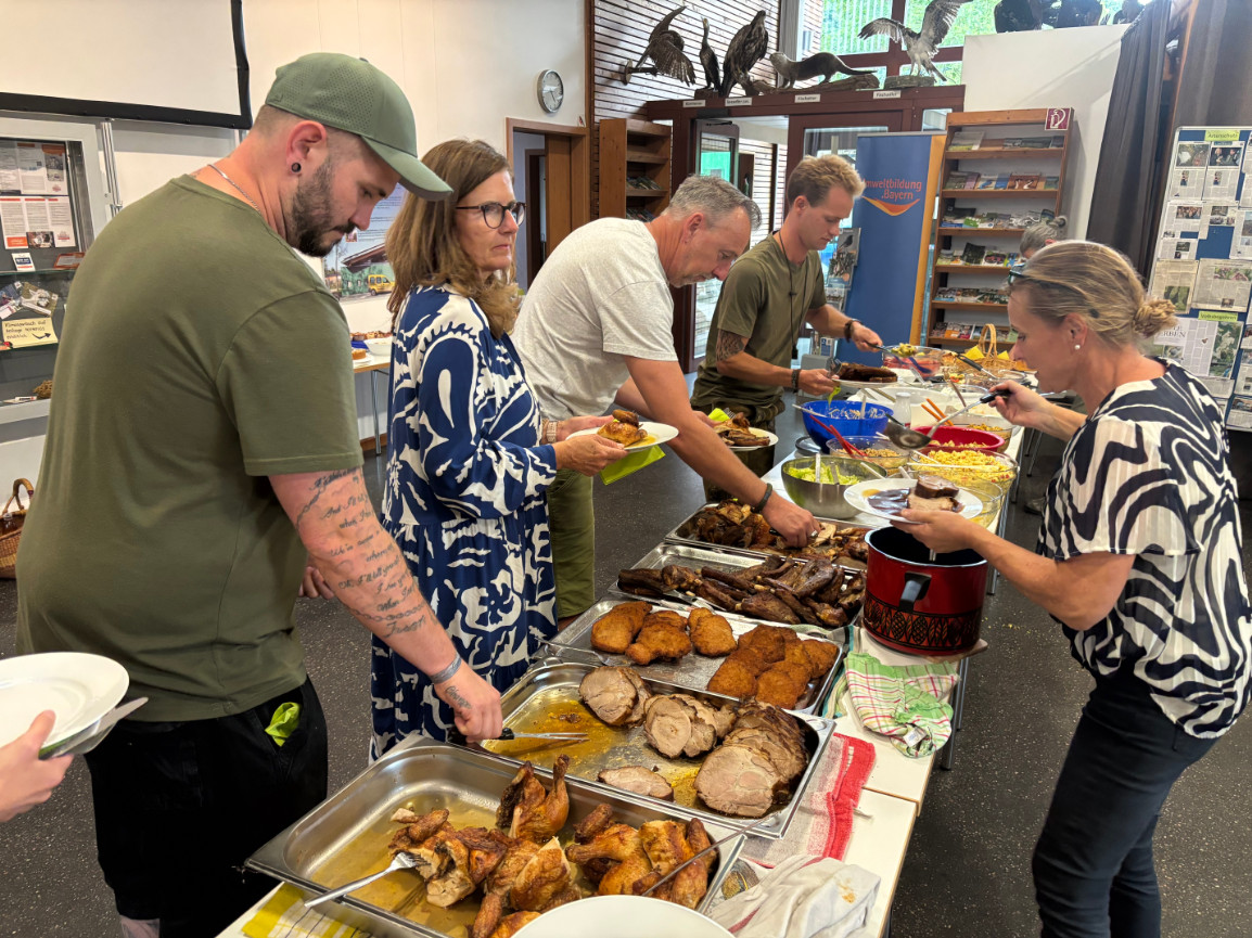 Frühjahr und Sommer sind in der Falknerei traditionell die Jahreszeiten der Völlerei: Mensch und Beizvogel schlagen sich ungestraft die Bäuche bzw. Kröpfe voll. Im Juli ist dann allerdings schon absehbar, dass die eine Fraktion den Gürtel bald wieder enger schnallen muss, und so viel sei verraten: Die Falkner sind dies nicht. Beim Sommerfest des bayerischen Landesverbandes wartet am 12. Juli ein wirklich erstaunliches Buffet auf die rund 80 Gäste. Alles, was das Herz begehrt, krosse Schweinshaxen und Spareribs, gebratene Hühnerschenkel, goldbraune Schnitzel, alles vom Landesverband spendiert. Dazu reihenweise mitgebrachte Salate, und von den Nachspeisen fangen wir mit Rücksicht auf alle nicht Dagewesenen besser gar nicht erst an.
