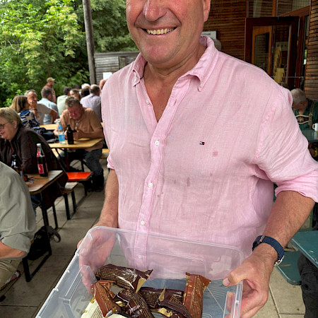 Der Einzige, der für so was an diesem wohltemperierten Nachmittag überhaupt keine Zeit hat, ist der Landesverbandsvorsitzende Michael Mickisch. Kaum hat er das Buffet feierlich eröffnet, ist er schon dreimal mit einem Bauchladen voller Eis am Stiel durch die Tischreihen gelaufen, welches kaum gelutscht ist, als Mickisch schon wieder dasteht, diesmal mit einem Korb voller Schnaps. Das beste Fläschchen – die Alte Marille - befindet sich wohlweislich ganz unten, bleibt von den Falknern aber dennoch nicht unbemerkt.
