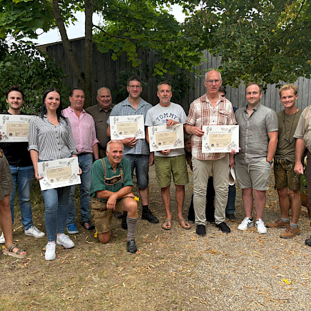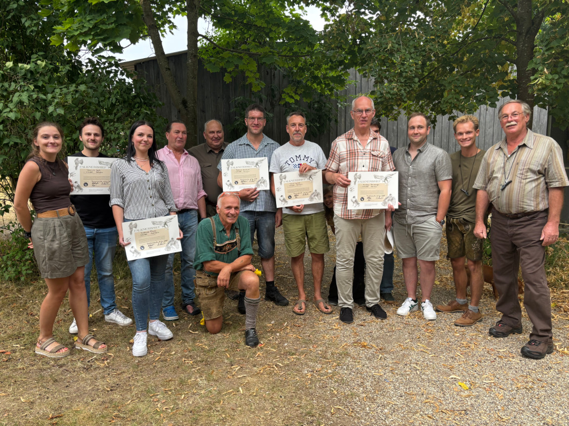 Vorher gibt es noch einen offiziellen Teil, für den Mickisch zum Messer greift: Falknerschlag. Sieben Teilnehmer des Falknerkurses sind in diesem Jahr zur Prüfung angetreten, alle sieben haben bestanden. Das spricht nicht nur für den Lerneifer des Nachwuchses, sondern auch für die Qualität des Lehrpersonals. Diesmal: Albert Hartl, Daniel Lodermeier, Rebecca Eichenseher, Hermann Balzer, Ferdinand Baer und Martin Lodermeier als Kursleiter.