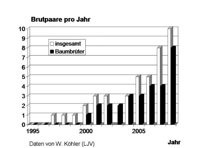 Die Fütterung erfolgte bis zur Selbstständigkeit. In MV wurden seit Beginn des Auswilderungsprojektes 1995 insgesamt 197 Jungvögel ausgewildert, wischen 4 und 24 pro Jahr. Bereits 1997 konnte das erste Felsbrüterpaar und 2000 das erste Baumbrüterpaar in MV registriert werden. Die Zahl stieg kontinuierlich an (Grafik links). 2008 wurden 10 Wanderfalkenhorste davon 8 Baumbrüter beobachtet. Ca. 100 Wanderfalken wurden seit Projektbeginn allein in MV wieder natürlich ausgebrütet (Grafik rechts), 23 allein 2008. Mit den zusätzlichen Adoptionen konnten insgesamt 200 Jungfalken über den Projektzeitraum in den Himmel Mecklenburg-Vorpommerns ausfliegen. In Anbetracht der hoffnungslosen Situation zwischen 1972 und 1996 ein toller Erfolg! Heute gibt es in Deutschland nachweislich 28 baumbrütende Wanderfalkenpaare. Damit ist das erklärte Ziel für die Bestandssicherung der baumbrütenden Wanderfalken erfüllt. Das „Projekt Wanderfalke“ kann abgeschlossen werden.