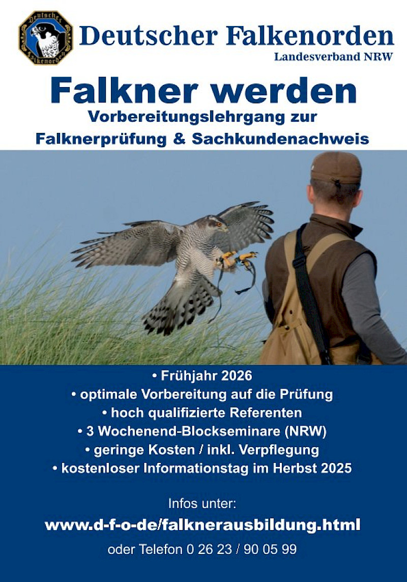 Das Jungfalknerseminar wird vom DFO Landesverband NRW eV seit mehr als 30 Jahren durchgeführt. Es dient zur Vorbereitung auf die Falknerprüfung sowie die Sachkundeprüfung zur Haltung von Greifen, Falken und Eulen im Lande NRW.