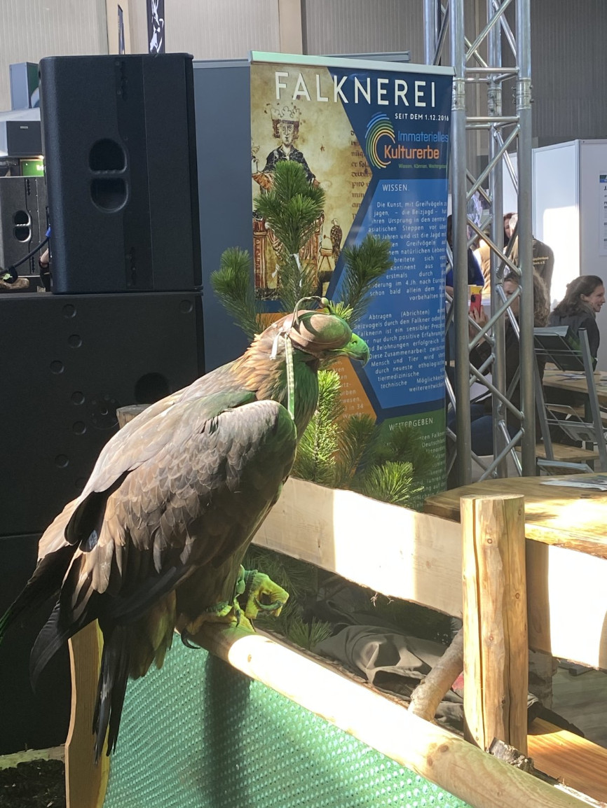 Am Stand des DFO-Landesverbands Sachsen konnten die Messegäste Beizvögel aus nächster Nähe erleben – darunter Steinadler, Falken und Bussarde. Fachkundige Falkner erklärten die Besonderheiten der einzelnen Arten, ihre Jagdtechniken und die anspruchsvolle Ausbildung der Vögel. Besonders eindrucksvoll war die Erläuterung zum Abtragen – jener Phase, in der der Vogel Vertrauen zu seinem Falkner aufbaut und schrittweise an die Umwelt gewöhnt wird.