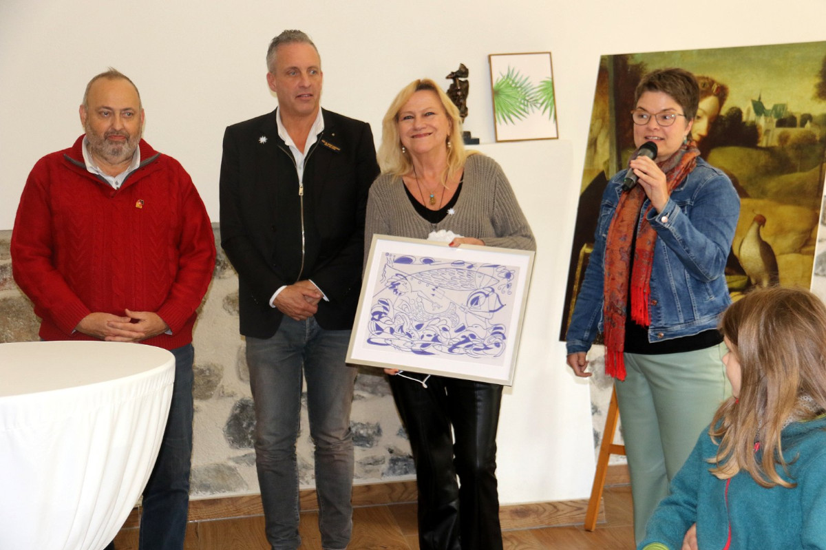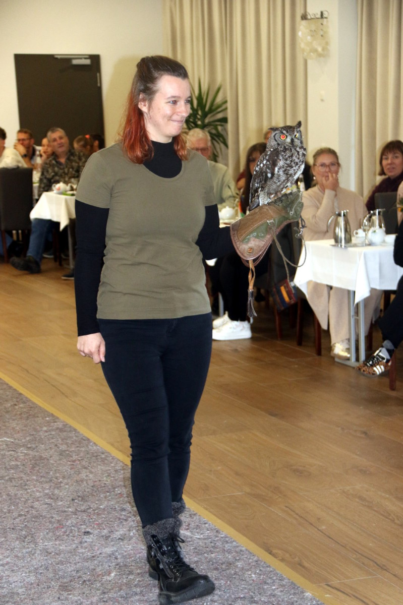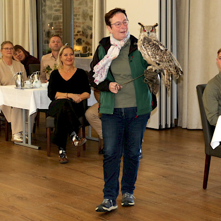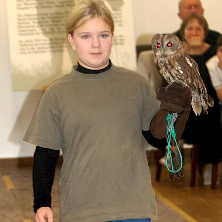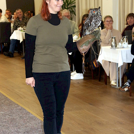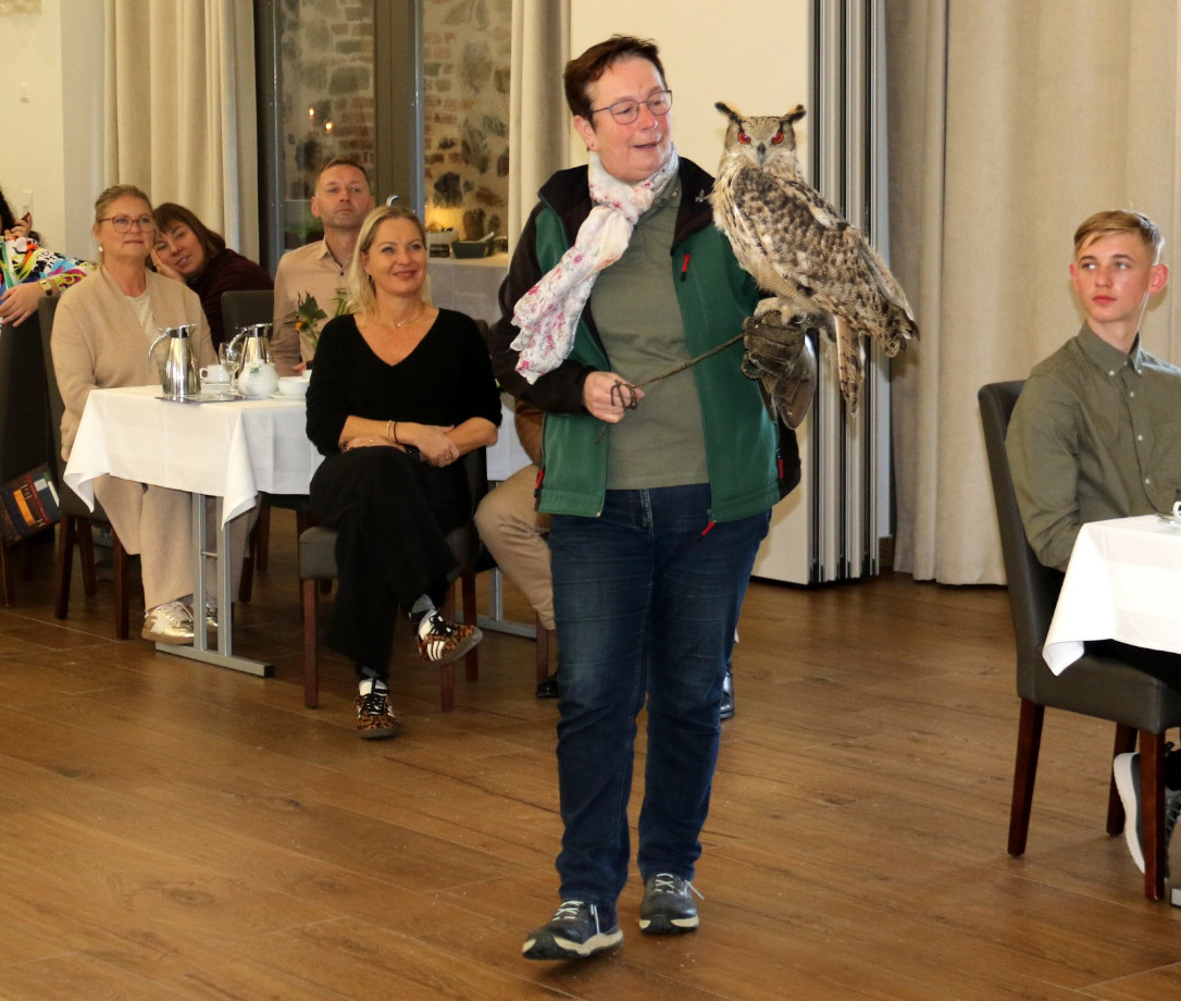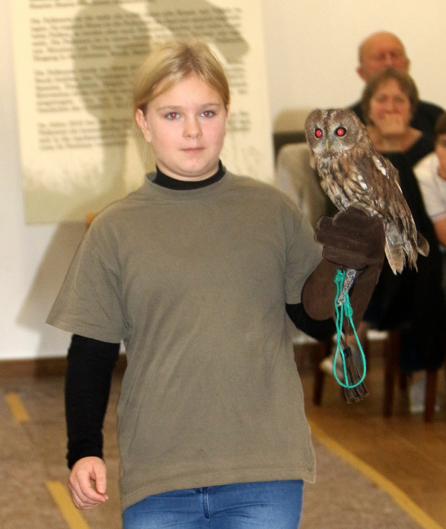 Mit einem Kurzfilm über den Deutschen Falkenorden begann ein erlebnisreicher Programmteil. Dr. Beate Feist, Vorsitzende des Landesverbandes Sachsen im Deutschen Falkenorden, berichtete über Vergangenheit und Gegenwart der Falknerei. Der kurze Vortrag zeigte das besondere Verhältnis zwischen Menschen und Greifvogel auf, beschrieb, wie umfassend die Arbeit der Falkner ist. Nicht nur die Beizjagd steht im Mittelpunkt, sondern u.a. auch die Pflege verletzter Tiere und die Aufklärung der Öffentlichkeit über den Nutzen der Arbeit mit diesen Tieren für unsere Umwelt. Nach dem Vortrag und einem Kurzfilm über Käuzchen übergab sie an die Falkner der Greifvogelwarte Oberlausitz. Die kleine Tochter der Falkner Sophia hatte sich vorbereitet und trug die wohl kleinste Eule im Saal herum. Beide gewannen sofort die Herzen des Publikums. Die nächsten Vögel ließen nicht auf sich warten. So wurden u.a. eine Schleiereule, ein Waldkauz und ein Steppenadler vorgeführt. Zum Schluss trug Felix Grimmig, das jüngste Mitglied des Falkenordens, den Steinadler des Präsidenten des RC Görlitz hinein. Freundin Franke übersetzte alle Erläuterungen für unsere polnischen Freunde.