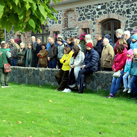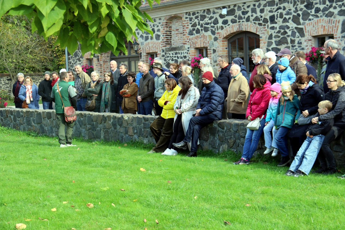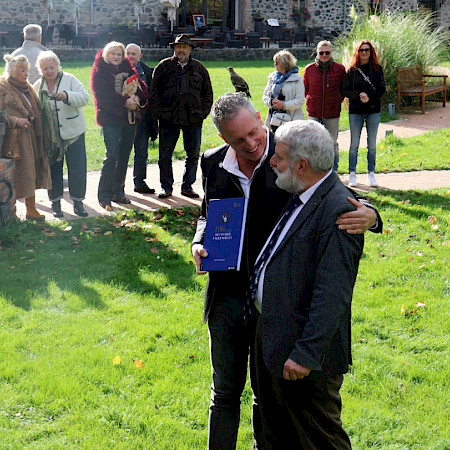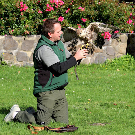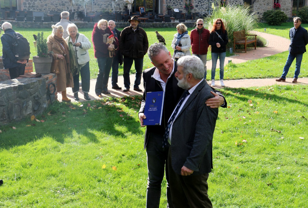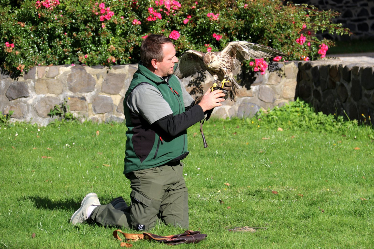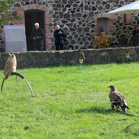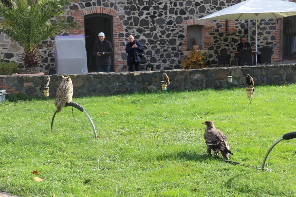 Dann rief der zweite Teil des Bruches mit einem zünftiger Wildgulasch alle an das Buffet. Die Veranstaltung im Saal wurde mit einem Grußwort des Governors und einem Erinnerungsgeschenk des RC Jelenia Gora beschlossen. Danach begaben sich alle zum Innenhof im Gut am See. Bei bestem Herbstwetter wurde eine sehr interessante Flugvorführung mit den Greifvögeln und Eulen geboten. Die unterschiedlichen Eigenschaften der vorgeführten Arten wurden eindrucksvoll erlebbar gemacht. Ein südamerikanischer Karakara erheiterte mit seiner lustigen und lauffreudigen Art. Zu guten Letzt stahl er die Wollmütze eines Freundes und Falkner Thomas Koban hatte alle Mühe, ihm das Diebesgut wieder zu entreißen. Wechselseitig flogen die Greifen zum Falkner, der sie mit Futter zu locken verstand. Die Beobachtungen des Zusammenspiels von Mensch und Tier war beeindruckend und hinterließ einen bleibenden Eindruck bei den Zuschauern. Einmal mehr wurde die einzigartige Mensch-Tier-Beziehung deutlich. Der Vogel nimmt seinen eigenen Lebensraum unabhängig vom Menschen in Anspruch, kehrt aber wegen seiner sozialen Interaktion immer wieder zum Menschen zurück. Abschließend gab es Gelegenheit, die auf der Freifläche aufgestellten Vögel in Ruhe zu beobachten und ihnen noch ein Stück näher zu kommen.
