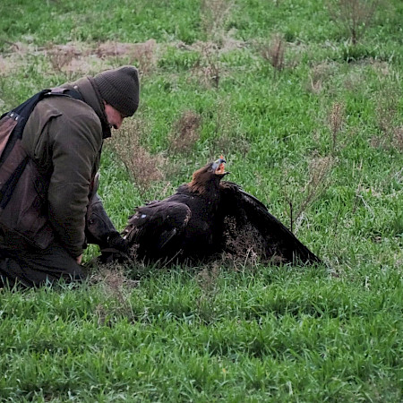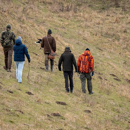 Gejagt wurde in insgesamt drei Revieren. Eines davon war so weitläufig, dass dort zwei Falknergruppen gleichzeitig beizen konnten. In den Revieren waren also zwei gemischte Gruppen unterwegs, zudem eine eigenständige Gruppe mit Steinadlern sowie eine Gruppe mit Harris Hawks. Ergänzend wurden Krähenjagden aus dem Auto durchgeführt.